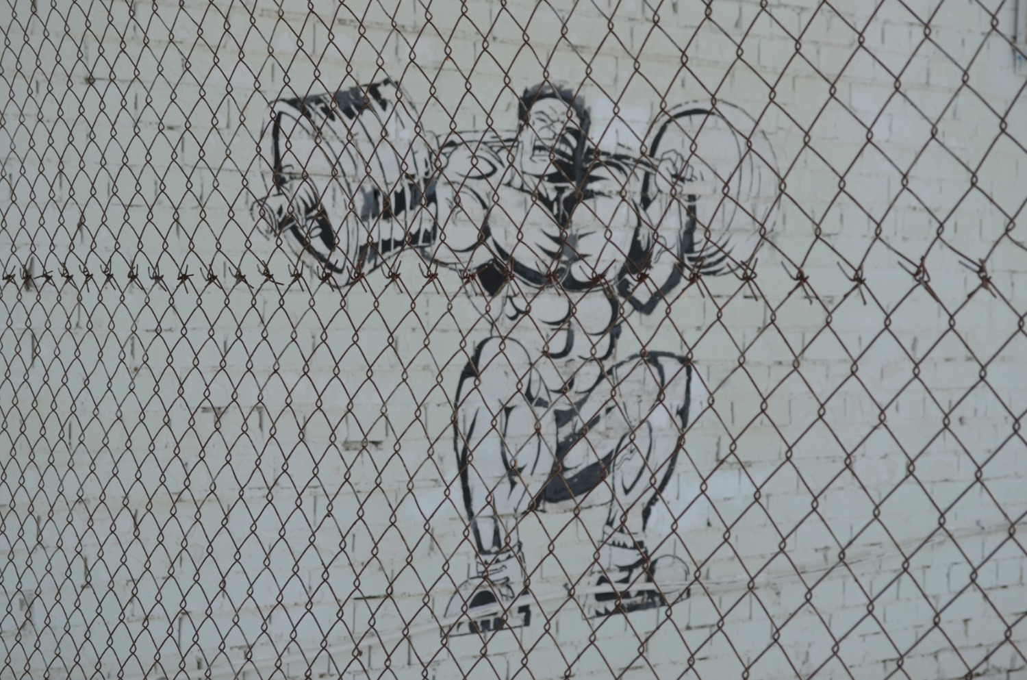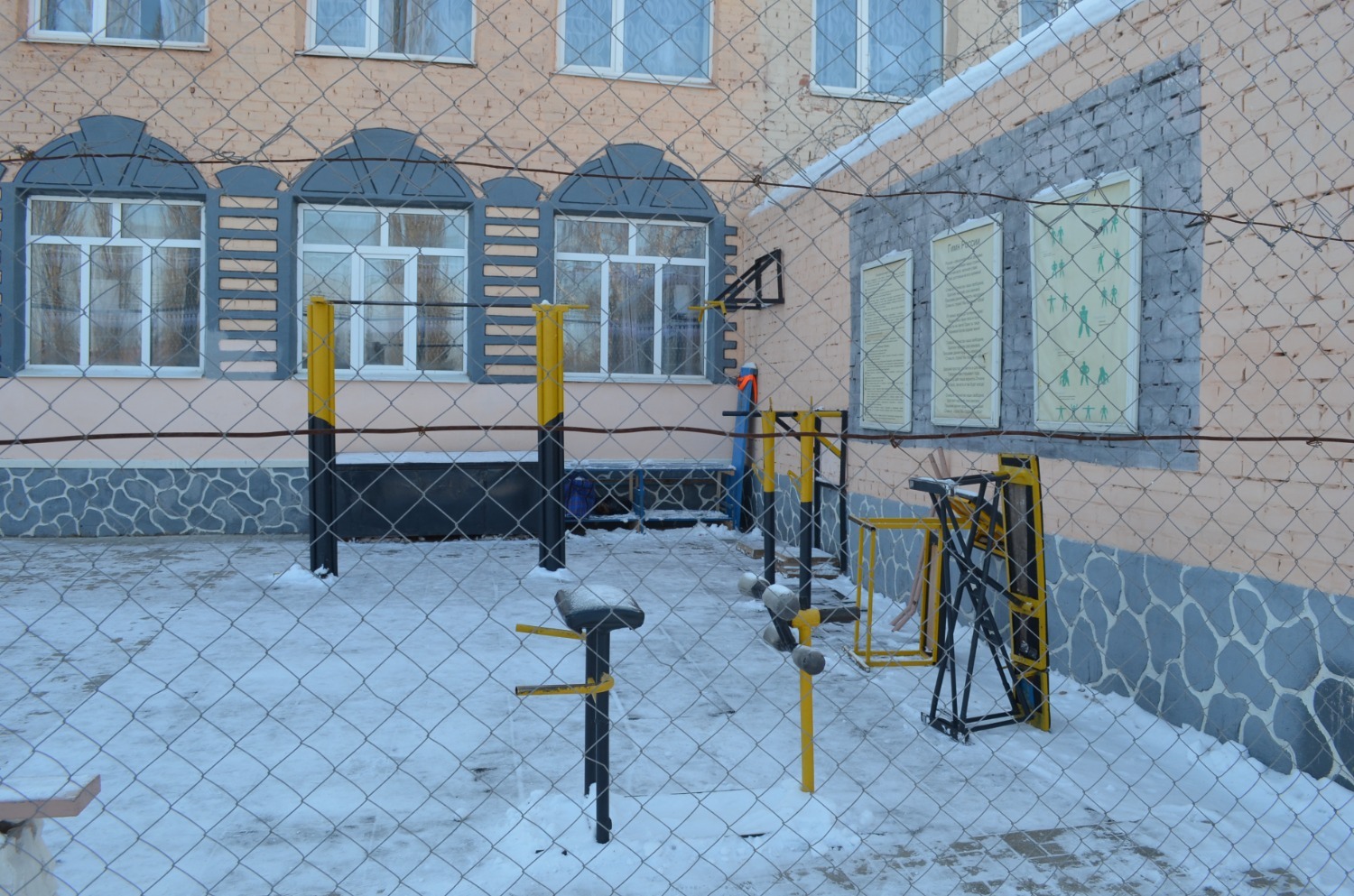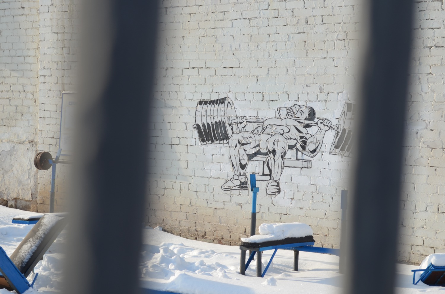Начальник третьего отряда, капитан внутренней службы Спартак Дильмухаметов сразу обратил внимание на большое футбольное поле, отметив, что не во всех исправительных учреждениях есть подобное место для спортивных игр. Чуть поодаль между корпусами под открытым небом оборудовали тренажерку, а стены украсили граффити, железные гимнастические снаряды покрылись снегом, но видно, что дорожки к ним расчищают. Также на улице размещены обтянутые железной сеткой-забором и колючей проволокой курилки. Для красоты у футбольного поля разместили колодец, а у столовой – работающий летом фонтан.