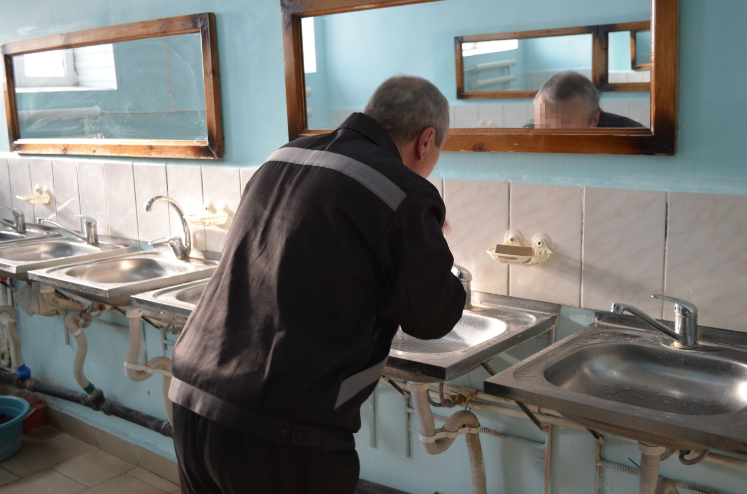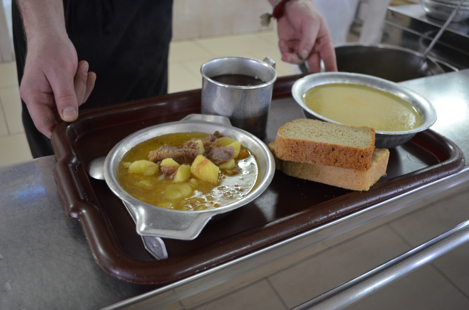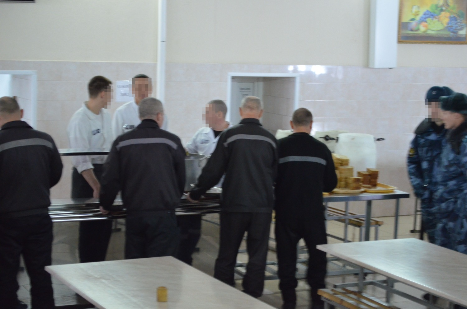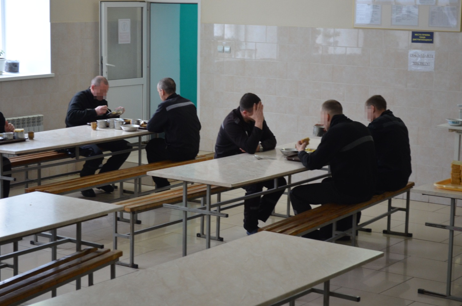 СТОЛОВАЯ. Знакомить с бытом осужденных продолжил начальник отдела по воспитательной работе ИК-8 майор внутренней службы Ильяс Даминов. Мы направились в столовую. В коридоре разместились стенды-мотиваторы по успеваемости отрядов в спорте и культурно-массовой деятельности, вешалки для одежды и раковины для мытья рук. Как раз один из отрядов пришел на обед. Осужденные друг за другом стояли в очереди за едой. На подносе уместились большая алюминиевая тарелка с супом, еще одна тарелка с блюдом «жаркое по-домашнему», а также кружка с компотом и хлеб.