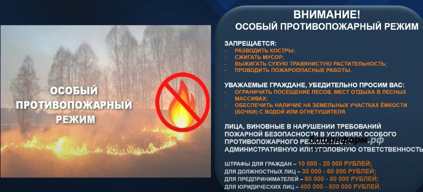 Для снижения рисков возникновения природных пожаров, а также пожаров в населенных пунктах, с учетом анализа прошлых лет и предстоящими майскими праздниками, руководитель МЧС по РБ Марат Латыпов предложил с 27 апреля до особого распоряжения ввести на всей территории республики особый противопожарный режим.