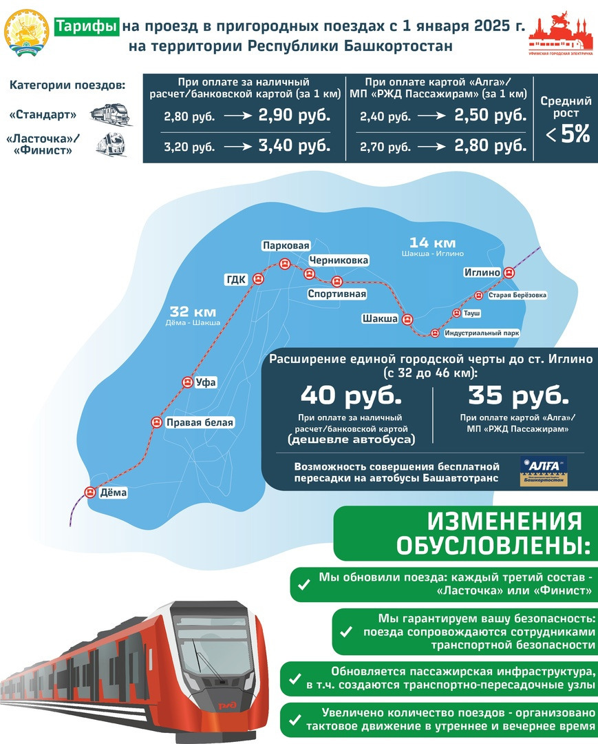 С 1 января граница Уфимской агломерации была расширена до станции Иглино с установлением единого тарифа на участке Дема – Иглино в 40 рублей. В 35 рублей обойдется проезд при покупке билета по карте «Алга» или в мобильном приложении «РЖД Пассажирам». Не удивительно, что в начале этого года был зафиксирован полуторакратный рост числа пассажиров со станции Иглино, достигший 800 человек в день.