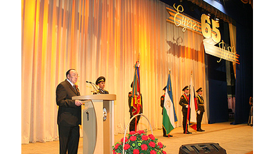 «В годы войны наша республика стала прочным и надежным тылом, где создавалось все необходимое для великой Победы. Сюда были эвакуированы заводы и население из прифронтовой полосы. Здесь формировались и готовились к боевым действиям военные соединения, - сказал он. - Благодаря самоотверженному труду рабочих заводов и фабрик, вся промышленность в кратчайшие сроки была перестроена на военный лад, заработала на нужды фронта. Республика освоила производство моторов для боевых самолетов, лучших сортов авиационного бензина, высокопрочной стали для танков и орудий, наладила выпуск боеприпасов, обмундирования и обуви.