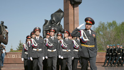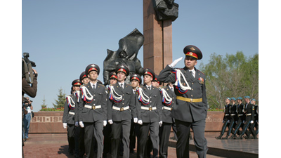 После исполнения гимнов Российской Федерации и Республики Башкортостан метроном отмерил минуту молчания, а затем состоялось торжественное прохождение знаменной группы, офицеров и курсантов. Марш принимали Президент республики Муртаза Рахимов, Председатель Госсобрания РБ Константин Толкачев, Премьер-министр Правительства РБ Раиль Сарбаев, другие официальные лица и ветераны Великой Отечественной. Затем цветы к памятнику Александру Матросову и Миннигали Губайдуллину возложили руководители министерств и ведомств, администрации Уфы, депутаты, ветераны, представители молодежных и общественных организаций. Далее участники торжественной церемонии проследовали к могиле дважды Героя Советского Союза Мусы Гареева и возложили к ней цветы.