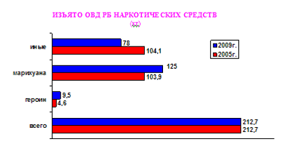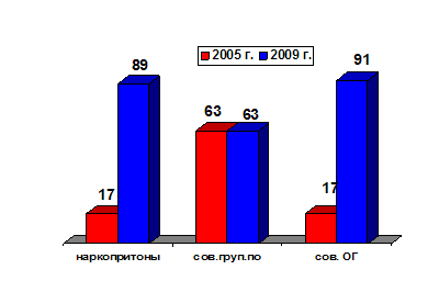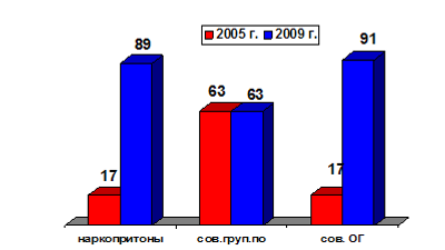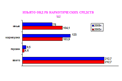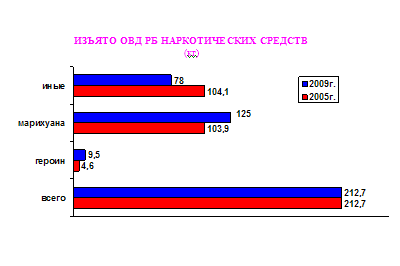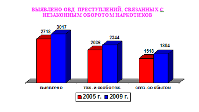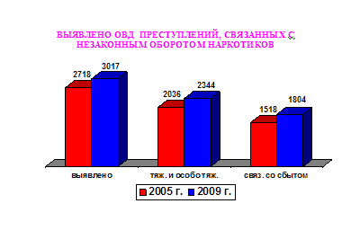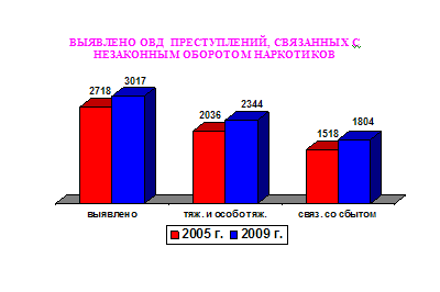 Количество выявленных ОВД республики преступлений в сфере НОН выросло с 2718 в 2005 году до 3426 в 2009 году, из них тяжких и особо тяжких – с 2036 в 2005 году до 2344 в 2009 году, в том числе связанных со сбытом наркотиков – соответственно с 1518 до 1804.