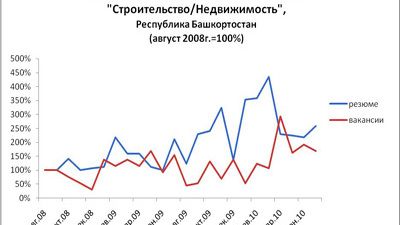 Спрос на специалистов строительных специальностей начал падать в третьем квартале 2008 года, достигнув критической точки в декабре 2008 года. Однако уже в начале следующего 2009 года количество вакансий в строительной сфере стало постепенно увеличиваться: ежемесячный прирост составлял порядка 10-12%. До второй половины 2009 года, когда произошла вторая волна спада, спрос держался на докризисном уровне. Начиная с февраля 2010 года количество вакансий работодателей Башкортостана, размещаемых на сайте ural.hh.ru в сфере «Строительство/Недвижимость» не опускалось ниже уровня августа 2008 года. В первом полугодии 2010 года спрос на строителей в республике на 20% превышает показатели аналогичного периода прошлого года.