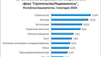 В 2010 году строительный рынок Башкортостана постепенно набирает обороты. Даже в условиях кризиса экономическая активность республики в этой отрасли была достаточно высокой. Благодаря этому ситуация на рынке труда Башкортостана в сфере «Строительство/Недвижимость» оставалась более стабильной, чем в большинстве российских регионов.