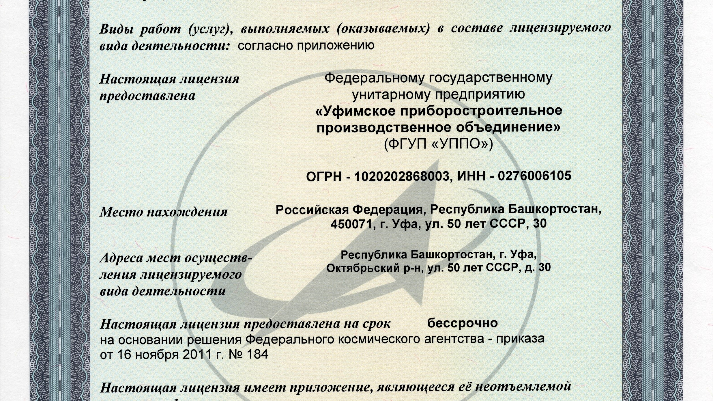 На основании решения Федерального космического агентства Уфимскому приборостроительному производственному объединению выдана бессрочная лицензия на осуществление космической деятельности.