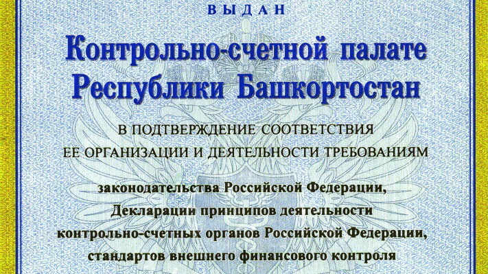 Контрольно-счетная палата Республики Башкортостан получила сертификат соответствия требованиям законодательства Российской Федерации, Декларации принципов деятельности контрольно-счетных органов России, стандартов внешнего финансового контроля.