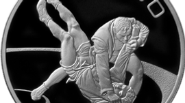 В этой же спортивной серии отчеканено три тысячи серебряных монет номиналом 3 рубля. Диаметр монеты – 39 миллиметров, масса чистого серебра – 31,1 грамма, проба сплава – 925. На оборотной стороне монеты также имеется изображение двух борющихся самбистов.