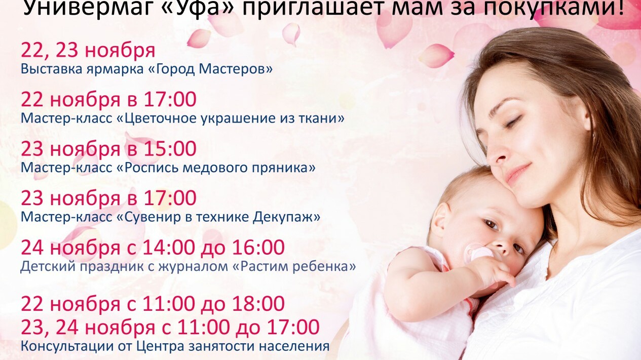 Универмаг «Уфа» поздравляет всех жителей Башкортостана с Днем Матери. Начиная с 22 ноября в магазинах действуют скидки и специальные предложения, молодые мамы смогут получить консультации по вопросам трудоустройства, а также посетить мастер-классы, которые будут организованы на 2 этаже универмага.