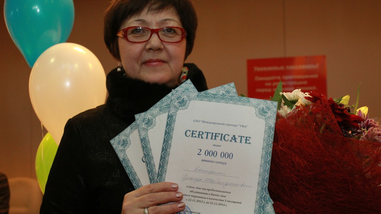 В подарок почетный пассажир получила пакет бонусных услуг: пятикратное обслуживание в бизнес-зале, бесплатное пользование автопарковкой в течение полугода и ужин на две персоны в любом ресторане аэропорта. Обслужившая двухмиллионного пассажира авиакомпания подарила Гульнур Ханафиной сертификат на бесплатный вылет по любому регулярному направлению из любого аэропорта России в течение года.