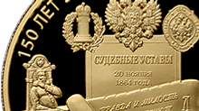 Золотая монета номиналом одна тысяча рублей «Учреждение Судебных Установлений от 20 ноября 1864 года» посвящена 150-летию эпохи Великих реформ. Масса чистого золота - 155,5 грамма, проба - 999. Тираж монеты - 250 штук.