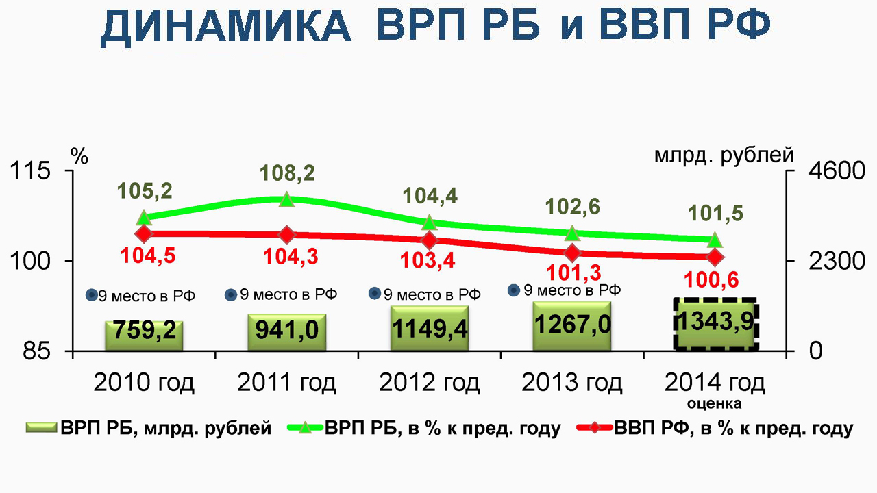 УФА, 12 мар 2015. /ИА «Башинформ», Эльвира Латыпова/. Валовой региональный продукт (ВРП) Башкортостана в 2014 году составил 1 трлн 343,9 млрд рублей, превысив уровень 2013 года на 1,5 процента, сообщается в материалах Министерства экономического развития республики.