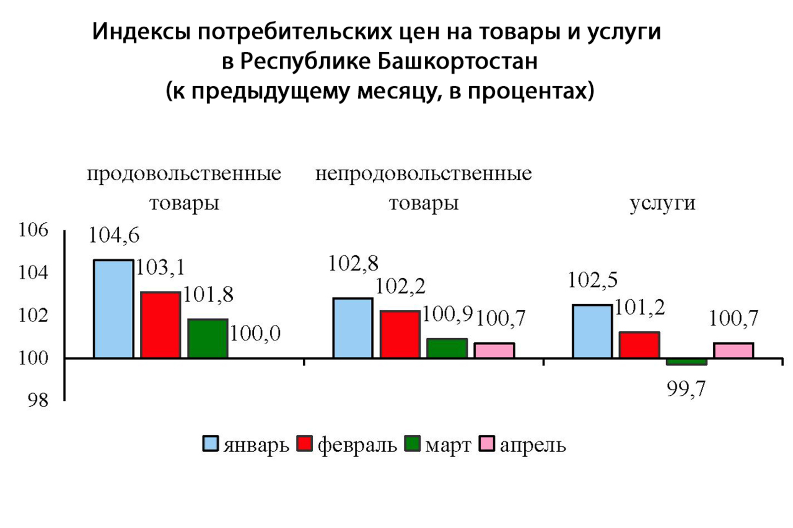 В целом инфляция в Башкортостане с начала года составила 7,2 процента (по России - 7,9). Апрельская инфляция к марту - 0,4 процента (по РФ - 0,5), к апрелю 2014 года - 15,3 процента (по РФ - 16,4).