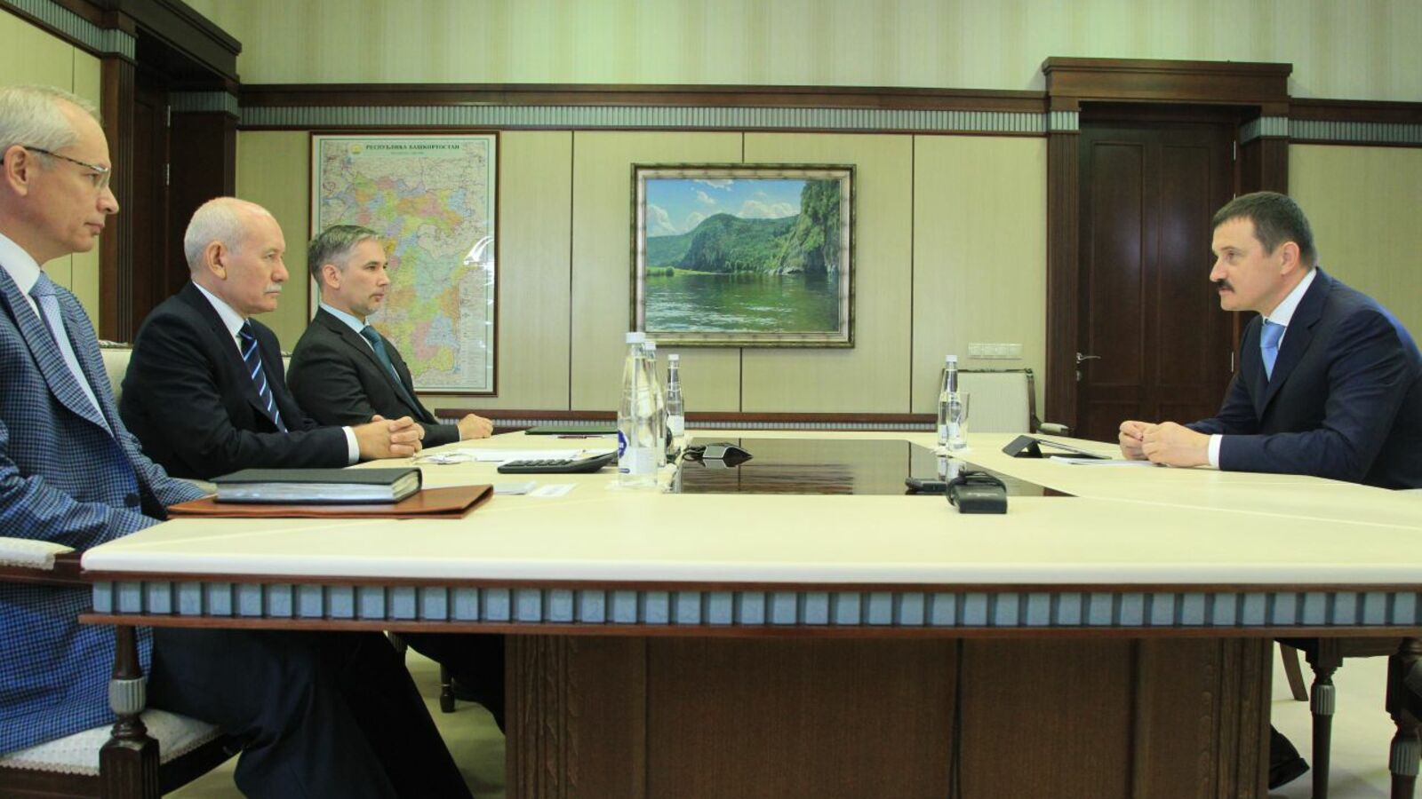 УФА, 17 авг 2015. /ИА «Башинформ», Илья Спиридонов/. 17 августа в Доме Республики Глава Башкортостана Рустэм Хамитов встретился с председателем правления акционерного коммерческого банка (АКБ) «Российский капитал» Михаилом Кузовлевым. Стороны обсудили вопросы санации ПАО «Социнвестбанк» и меры по восстановлению работы финансового учреждения.
