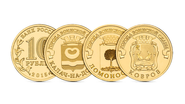 Как сообщает пресс-служба Банка России, в обращение выпускаются монеты серии «Города воинской славы» из недрагоценных металлов номиналом 10 рублей. Серия пополнится тремя новинками: «Калач-на-Дону», «Ковров», «Ломоносов». В этой серии уже находятся в обращении 33 монеты. Последняя, «Грозный», была выпущена в сентябре 2015 года. Тираж монет - по 10 млн штук каждого вида. Новые монеты являются законным средством наличного платежа на территории России.