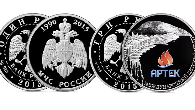 сообщению пресс-службы Банка России, еще одна серебряная монета, номиналом в три рубля (тираж — одна тысяча штук), посвящена Международному детскому центру «Артек». На ее оборотной стороне изображена гора Аю-Даг и на ее фоне - панорама «Артека» и цветной логотип детского центра.