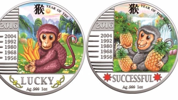 Оригинальным подарком близким может стать коллекция монет с пожеланиями: «На счастье», «На удачу», «На успех» и «На изобилие». На реверсе каждой монеты находится яркое изображение озорной мартышки, готовящейся полакомиться фруктами - ананасами, виноградом, бананами и яблоками. Коллекция выполнена из серебра 999 пробы, вес каждого экземпляра - 31 грамм, диаметр - 4 см.