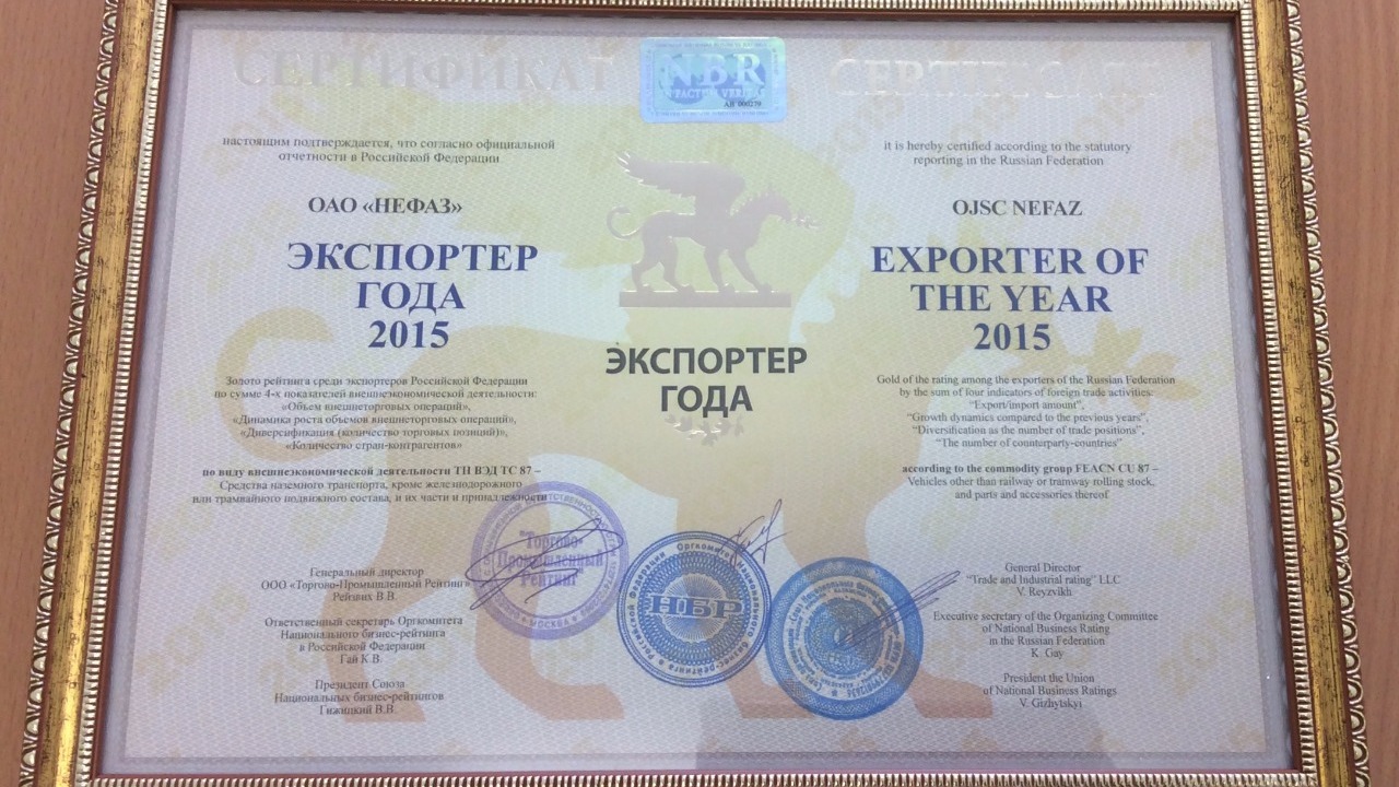 По сумме четырех показателей внешнеэкономической деятельности ОАО «НефАЗ» находится в золотом рейтинге «Экспортер года» в товарной группе «Средства наземного транспорта». Предприятию вручены официальный международный сертификат и медаль «Экспортер года-2015».