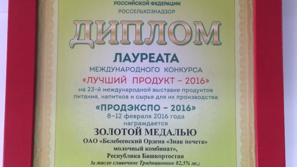 Белебеевский молочный комбинат стал лауреатом международного конкурса «Лучший продукт-2016 года»