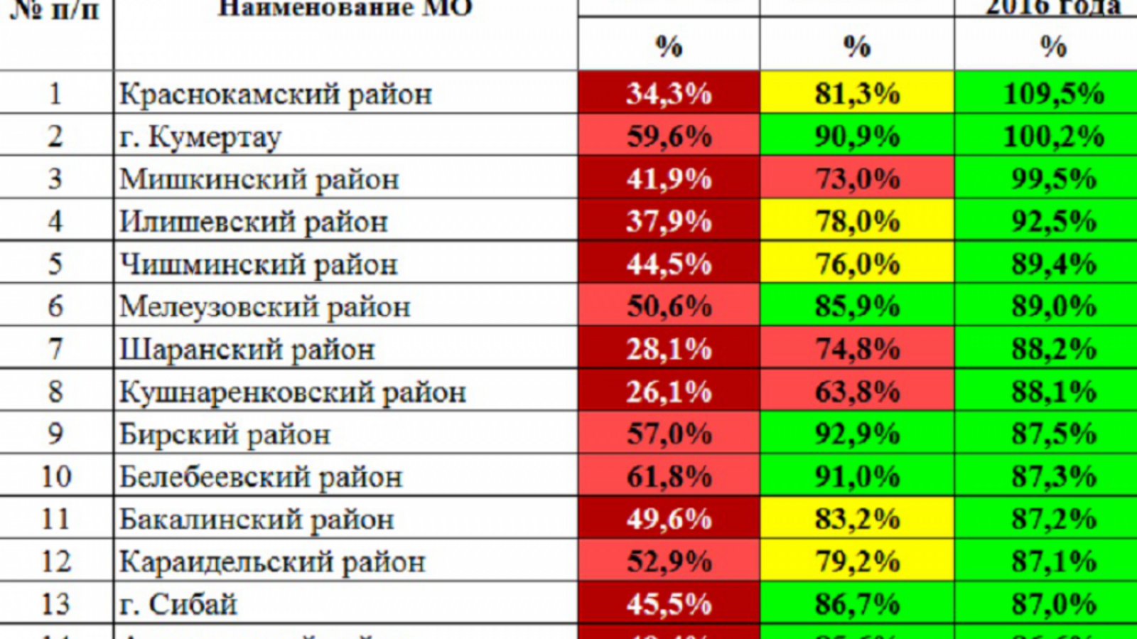 По итогам первого квартала 21 муниципальному району (городскому округу) присвоен «зеленый» индикатор, что соответствует сбору средств более 85 процентов. «Желтый» индикатор присвоен 27 районам, в которых собираемость превысила 75 процентов, но ниже 85 процентов. 15 районов Башкортостана получили «красный» индикатор. В них сборы на капремонт выше 50, но ниже 75 процентов.