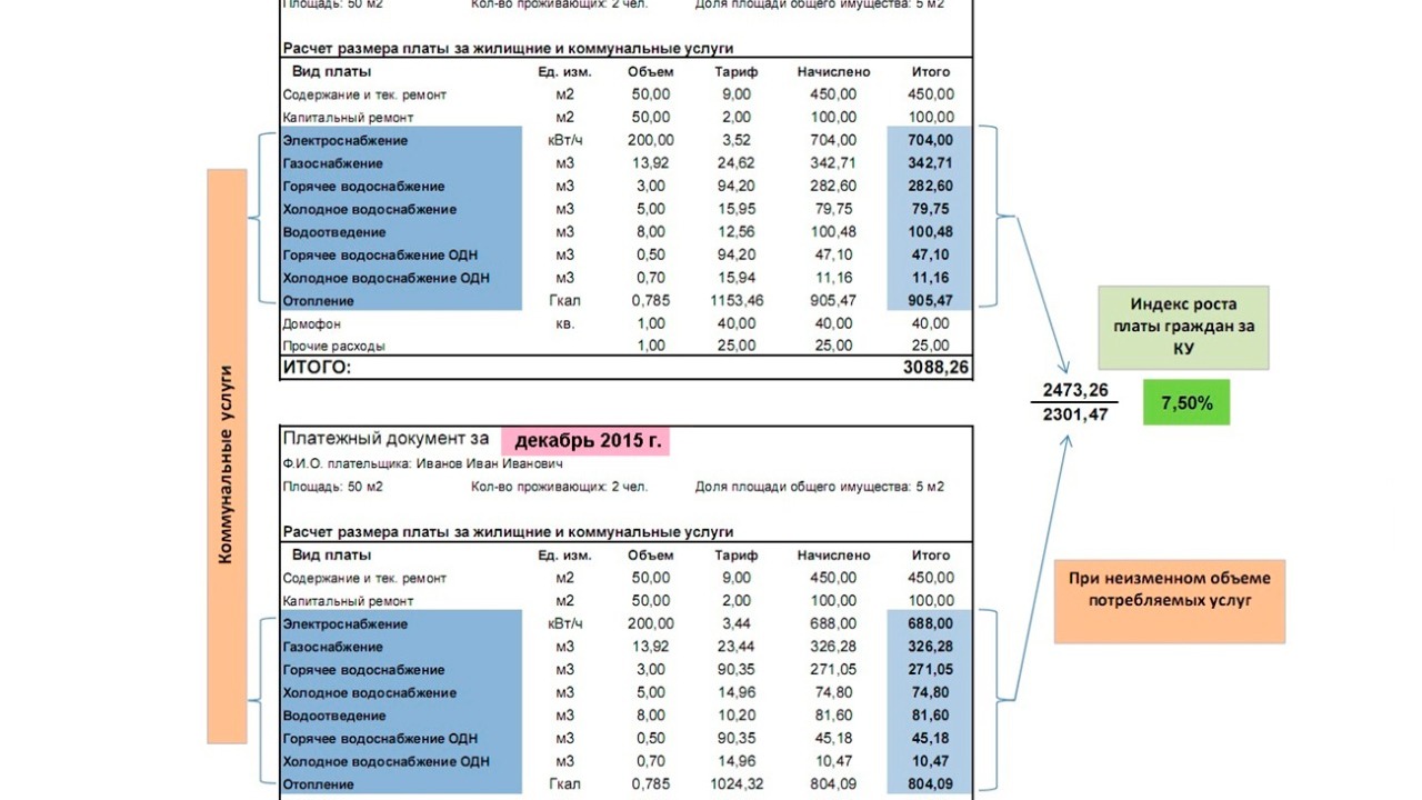 «Рассчитать прирост может каждый. Для этого необходимо отдельно высчитать плату за коммунальные услуги за декабрь 2015 года и за июль 2016 года. При этом следует предусмотреть сопоставимый объем потребления. Сумму за июль поделим на сумму за декабрь и умножим на 100. В итоге получится изменение платы в процентах. Затем сравниваем результат с установленным предельным индексом по вашему муниципальному образованию, чтобы выяснить соответствие. Узнать индекс можно в управляющей компании», — рассказали в Госкомитете РБ по тарифам. В ведомстве отметили, что при формировании новых тарифов ресурсные организации заявили гораздо более высокие расходы, которые комитет снизил на 17,5 млрд рублей. Иначе плата за комуслуги была бы на порядок выше.