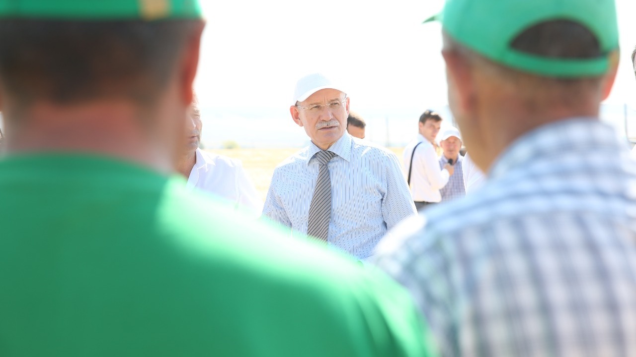 УФА, 20 авг 2016. /ИА «Башинформ», Александр Смирнов/. 20 августа Глава Башкортостана Рустэм Хамитов во время рабочей поездки в Чекмагушевский район проинспектировал ход уборки урожая на полях сельскохозяйственного производственного кооператива «Базы» у села Урняк.