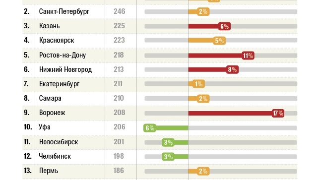 Самые дорогие ланчи — ожидаемо в Москве (от 286 руб.), самые дешевые — в Омске (от 166 руб.).  В Уфе средняя цена самых недорогих комплексных обедов – 206 рублей,  у нас же произошло самое заметное снижение цен – минус 6%.