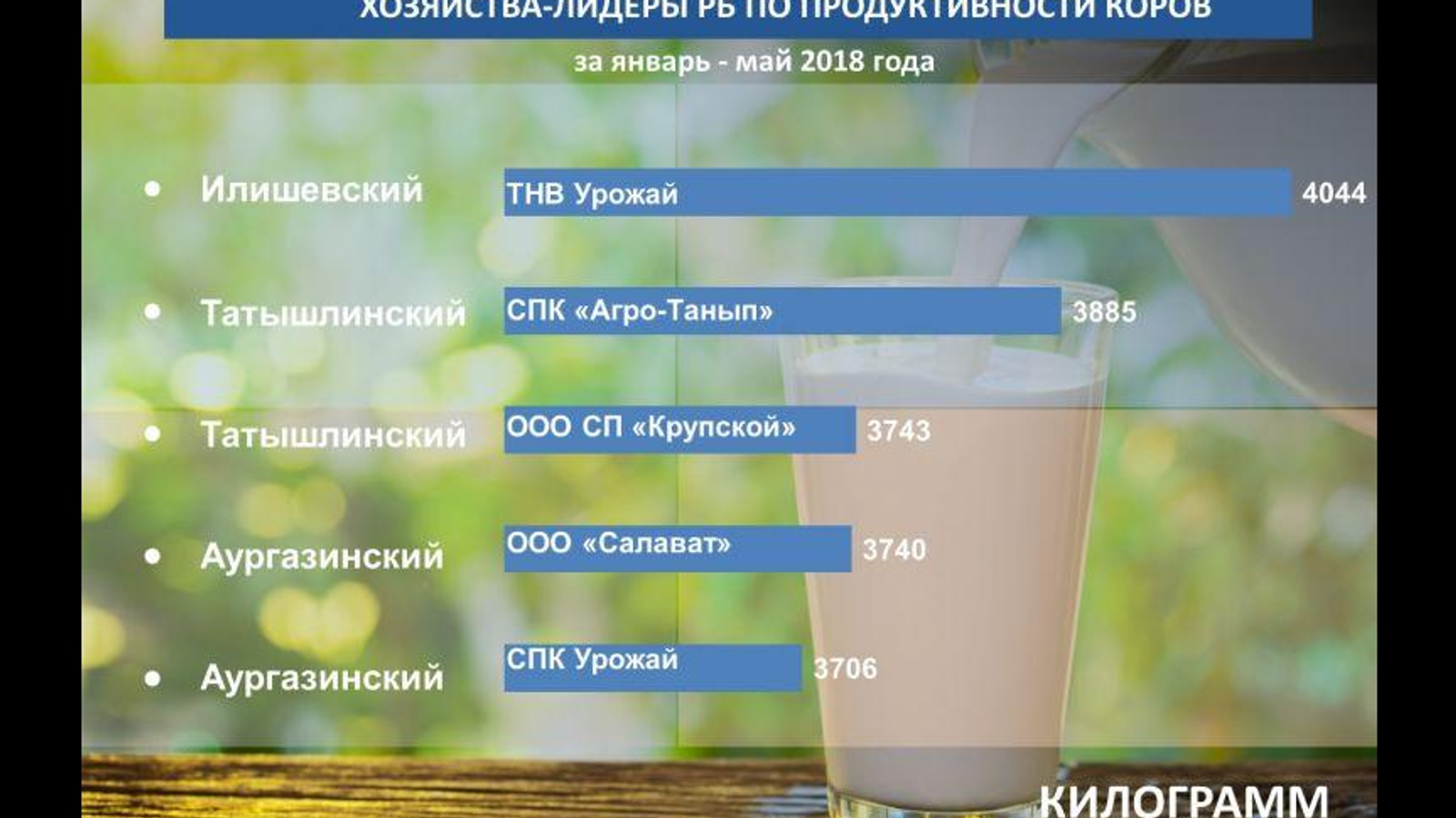 В пятерке лидеров по продуктивности коров ТНВ «Урожай» Илишевского района (надой на одну корову с начала года составил 4044 кг), СПК «Агро-Танып» Татышлинского района (3885 кг), ООО СП «Крупской» Татышлинского района (3743 кг) , ООО «Салават» (3740 кг) и СПК «Урожай (3706 кг) Аургазинского района.