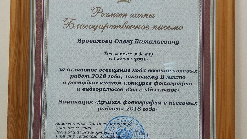 Фотокорреспондент агентства «Башинформ» отмечен наградой за освещение посевных работ в республике