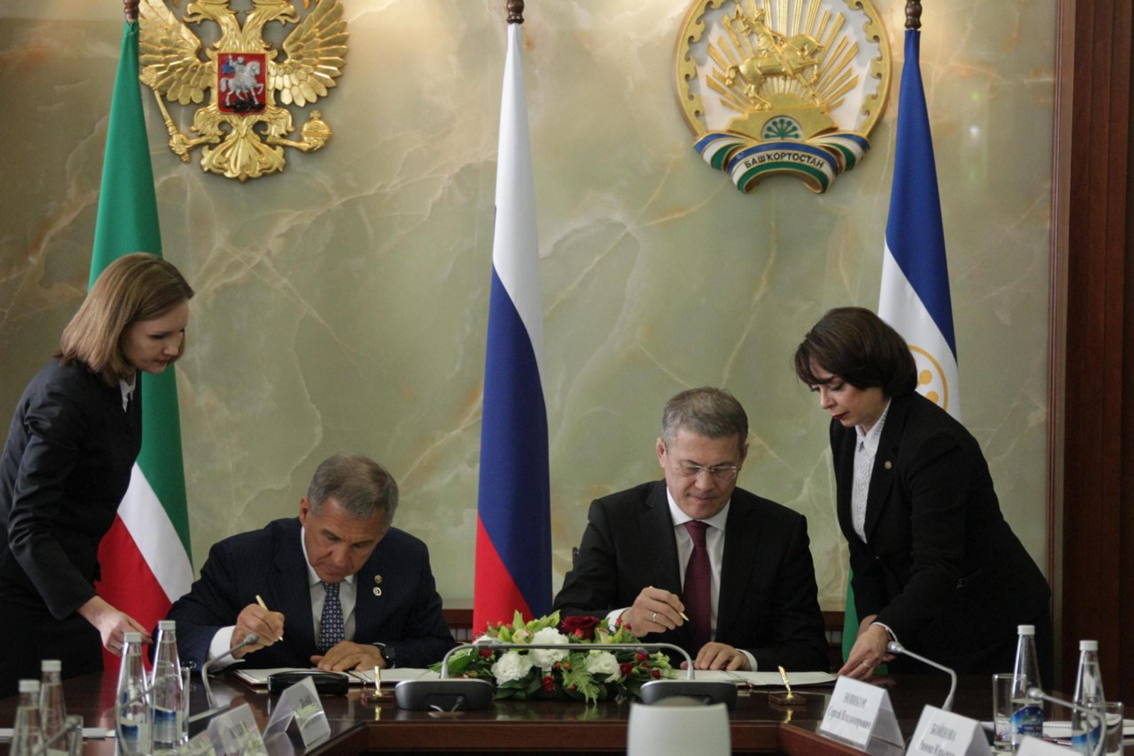 УФА, 18 апр 2019. /ИА «Башинформ», Галина Бахшиева/. Врио Главы Башкортостана Радий Хабиров и Президент Татарстана Рустам Минниханов подписали 18 апреля в Уфе соглашение между двумя правительствами о торгово-экономическом, научно-техническом, социальном и культурном сотрудничестве. Соглашение было подписано в рамках проведения Дней Татарстана в Башкортостане.