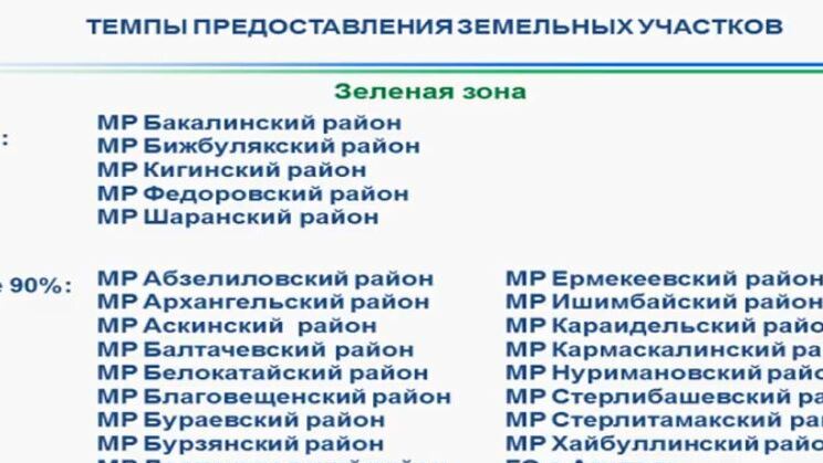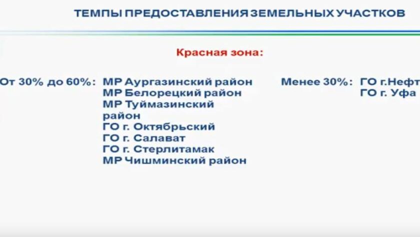 Руководитель ведомства отметил, что Башкирия находится на втором месте в ПФО по выделению земельных участков нуждающимся. Обеспеченность составляет 67%. В девяти районах – стопроцентное выполнение, а в 18-ти – от 30 до 60%.