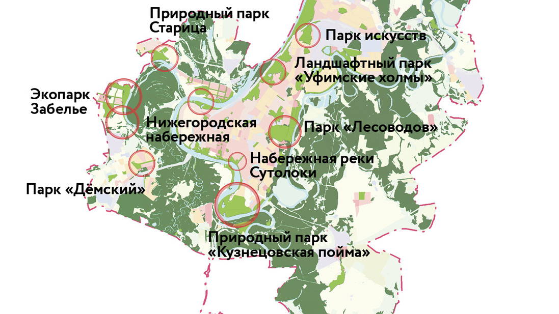 Как отмечают московские специалисты, природный ландшафт Уфы имеет продольную структуру с резкими перепадами высот, что создает сложности в освоении территории. Окончательный вариант расположения новых рекреационных зон будет принят с учетом утвержденной концепции пространственного развития города.