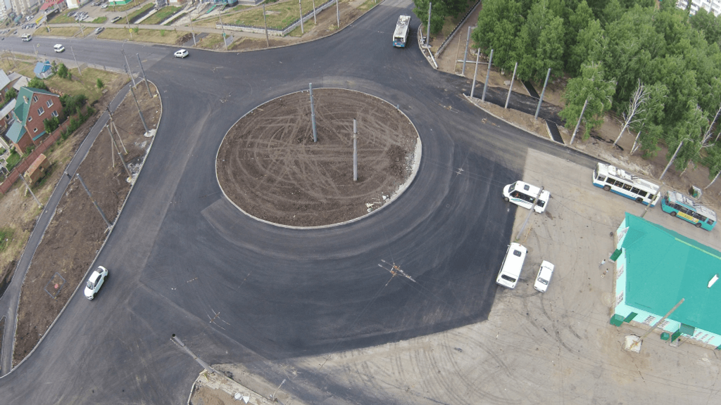 На перекрестках заканчиваются устройство верхнего слоя покрытия и тротуаров. Согласно контракту, подрядчики должны благоустроить территорию. Срок окончания работ — до 31 июля.