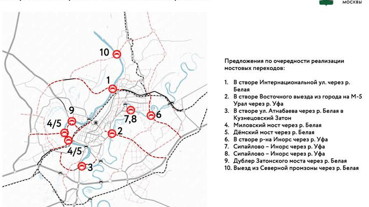 Первый в списке - мост через реку Белую в створе улицы Интернациональной, обеспечивающий альтернативный выезд из северной части города в сторону Затона, Забелья и федеральной трассы М-7. На втором месте - строительство моста через реку Уфу в рамках реализуемого с 1992 года проекта Восточного выезда, связывающего проспект Салавата Юлаева с Зауфимьем и федеральной трассой М-5. Третьим должен быть построен мостовой переход в Кузнецовском затоне, с выездом на трассу в аэропорт и далее - на Оренбургский тракт. На 4-5 местах расположились Миловский и Демский мосты. Они должны разгрузить выезд у Монумента Дружбы от транспорта, идущего в эти активно застраиваемые микрорайоны.