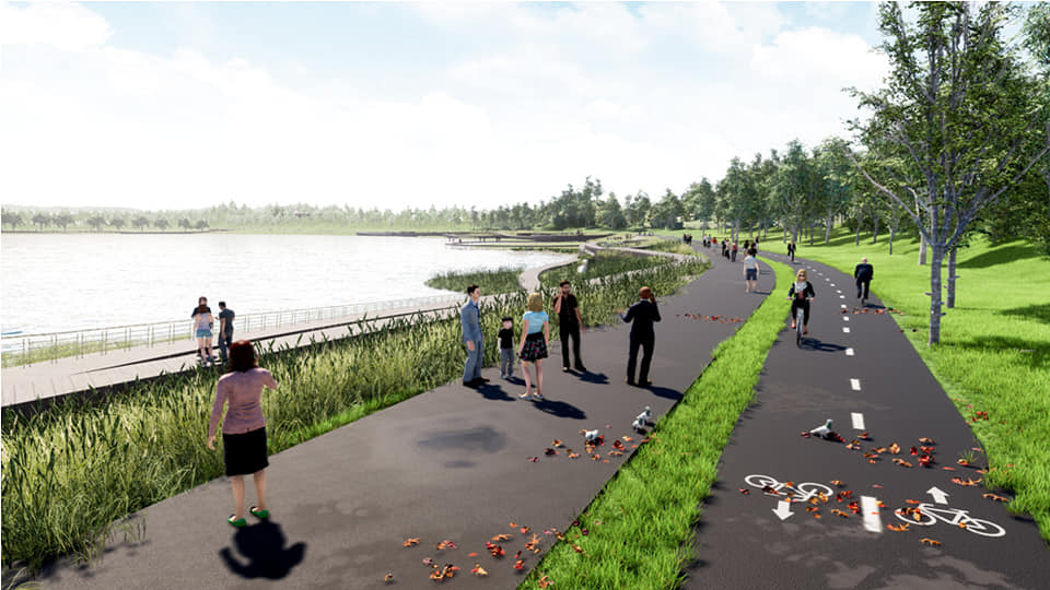 Прогулочную зону вдоль озера расширят для размещения по всему периметру велодорожки в оба направления с нормативной шириной. Проектная ширина тротуара открывает доступ к объектам для крупной техники (снегоуборщики, погрузчики, пожарные машины).