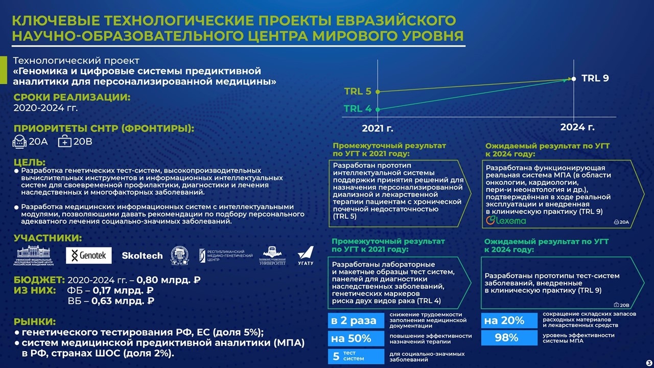 «По направлению «Биомедицина и генетика» идентифицированы 32 новых локуса и 192 гена, ассоциированных с разными подтипами рака молочной железы. Это позволяет выявить практически все основные причины возникновения такого вида рака и мишени для его лечения. Работа выполнена с партнерами НОЦ из Германии, Канады, Израиля, Великобритании, Японии. В этом году планируем открыть лабораторию онкогеномики на базе УФИЦ РАН, что позволит осуществлять подбор таргетной терапии для лечения онкологических заболеваний по ряду видов рака (из 500 видов терапий протоколы лечения в России применяют только 4-5 видов)», - пояснил Радий Хабиров.Руководитель республики отметил, что создана и внедрена в региональных Центрах гемодиализа уникальная, не имеющая аналогов в мире по точности интеллектуальная система поддержки принятия решений для назначения персонализированной диализной и лекарственной терапии. К 2024 году республика планирует расширить область применения этого цифрового решения под другие заболевания, интегрировав его с генетическими тест-системами в России и за рубежом (Китай, Казахстан).