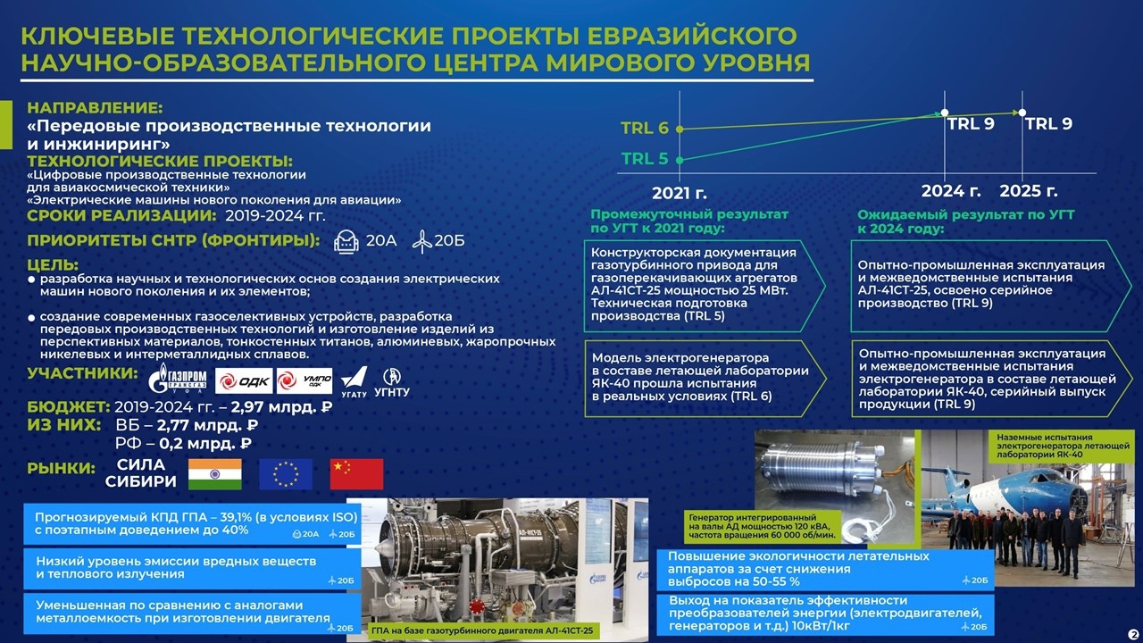 «1 декабря 2020 года состоялся первый полет авиалайнера МС-21 с двигателем ПД-14. Ученые УГАТУ внесли вклад в проект ПД-14: разработаны технологии изготовления инновационных лопаток из алюминида титана, моноколес и полых широкохордных лопаток», - написал глава региона.Второй проект по данному направлению – газоперекачивающий агрегат на базе газотурбинного двигателя АЛ-41СТ мощностью 25 МВт. Он будет использоваться «Газпромом». Благодаря инженерам «ОДК-УМПО», ученым республики «боевые» двигатели, которые применяются в авиации, обретают новые перспективы в мирной жизни. Изготовление двух опытных образцов завершится в 2022 году, опытно-промышленная эксплуатация и межведомственные испытания начнутся в 2023 году.