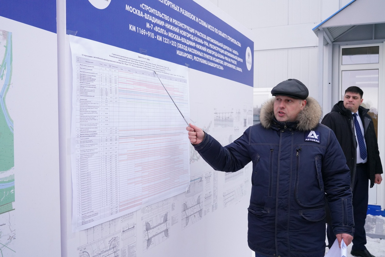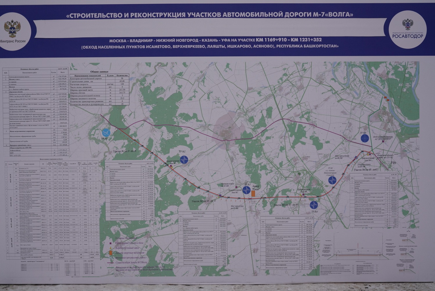 Сегодня в Дюртюлинском районе Глава Башкортостана Радий Хабиров и руководитель Федерального дорожного агентства Роман Новиков ознакомились с ходом строительства и реконструкции автомобильной дороги М-7 «Волга» в обход населенных пунктов Исаметово, Верхнеяркеево, Лаяшты, Ишкарово, Асяново Илишевского и Дюртюлинского районов. Участок данной трассы от границы с Татарстаном до города протяженностью 65 км входит в маршрут автодороги М-12 «Москва – Нижний Новгород – Казань – Екатеринбург» на территории и он будет дублером действующей трассы, проходящей по пяти населенным пунктам.