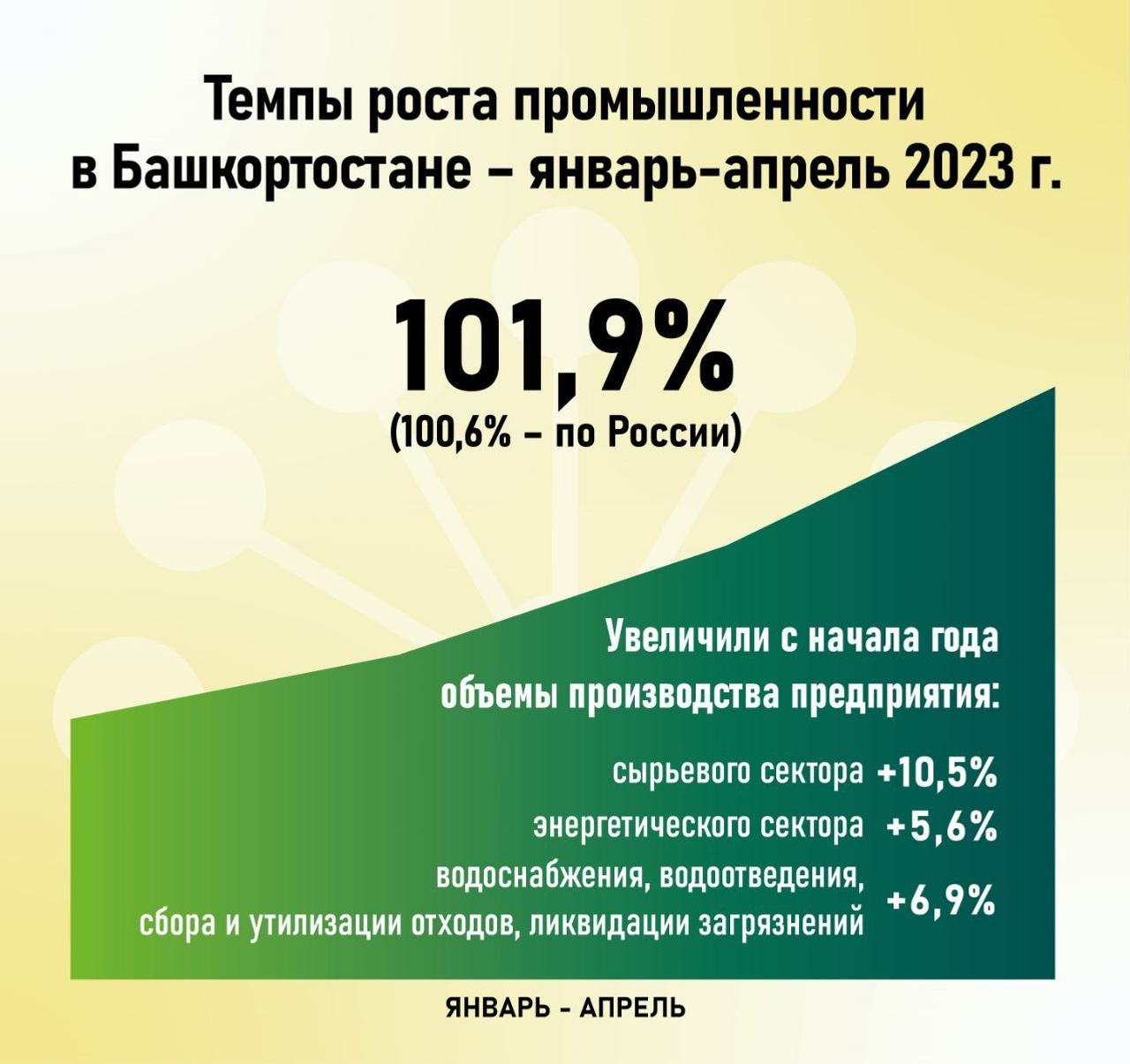 Индекс промышленного производства в Башкирии в апреле 2023 года составил 110% по отношению к аналогичному периоду прошлого года. В январе-апреле – 101,9%. Это лучше, чем в среднем по России – 105,2 % и 100,6 % соответственно. Об этом в соцсетях написал Глава Башкирии Радий Хабиров.
