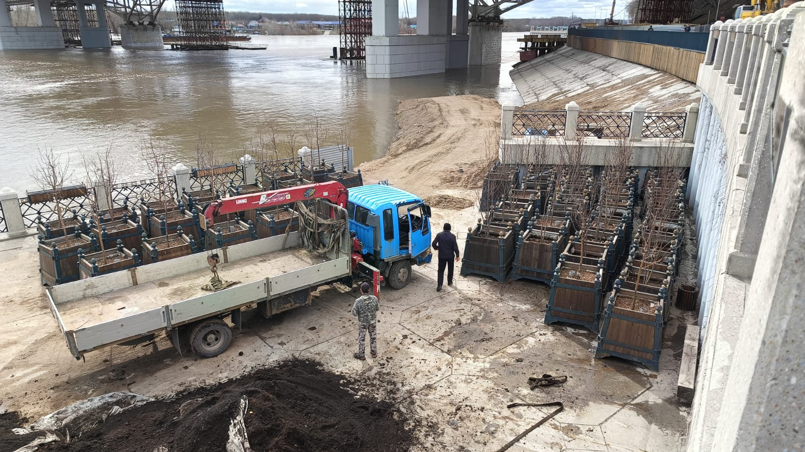 В Уфе начинается озеленение набережной Белой. Сотрудники коммунальных служб готовят кадки и вазоны для декоративных деревьев и кустарников, которые будут установлены в разных местах объекта.