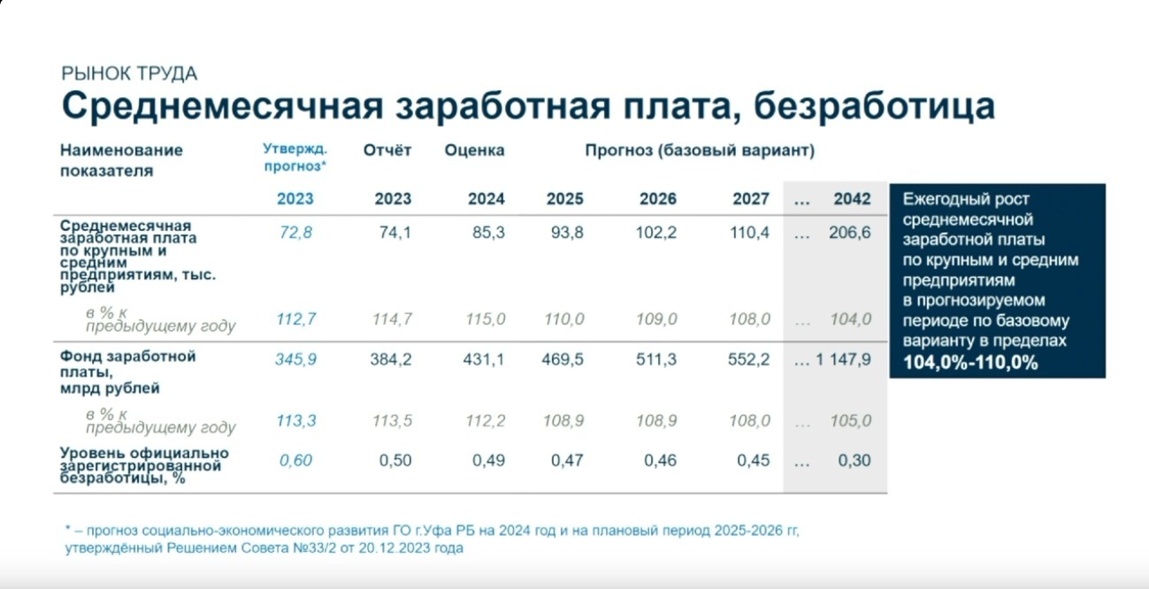 «Размер среднемесячной заработной платы на крупных и средних предприятиях и организациях города Уфы за 2024 года достигнет 85,3 тысячи рублей с темпом роста 115%. В прогнозируемом периоде, по всем вариантам развития, ожидается увеличение среднемесячной зарплаты от 92,1 до 110,4 рублей», – сказал чиновник.
