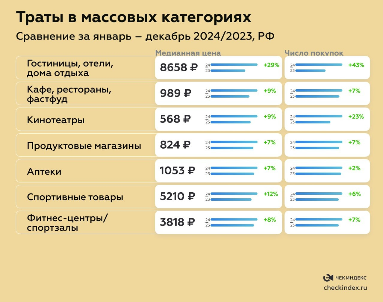 Самый большой рост произошёл по направлению "Отдых": средняя цена покупки (проживание в гостиницах, отелях, турзбазах) выросла на 29% по стране, а число покупок выросло на 43%.