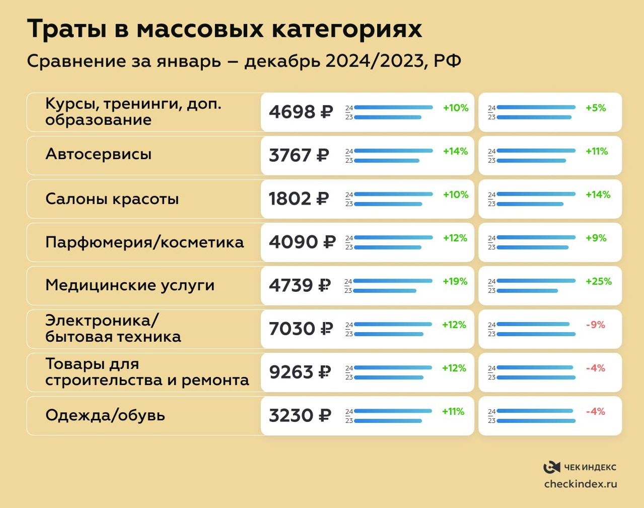 Внутренний спрос в России в 2024 году продолжал набирать обороты. По данным ресурса «Чек Индекс», рост потребления особенно заметен по тратам на отдых и развлечения, красоту и здоровье, продукты питания и общепит. А вот крупные покупки: бытовая техника и электроника, товары для ремонта, одежда и обувь — показали снижение.