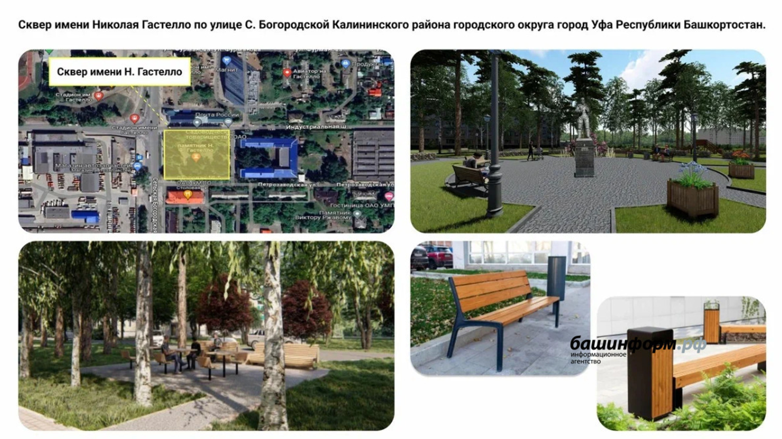 Согласно опубликованным данным, в ходе благоустройства подрядчик должен установить новую систему наружного освещения, заменить асфальт на пешеходных дорожках и слой чернозема на газонах, а также спилить аварийные деревья. В ходе работ в сквере высадят четыре ели, установят 12 скамеек, 6 урн и две входные арки.
