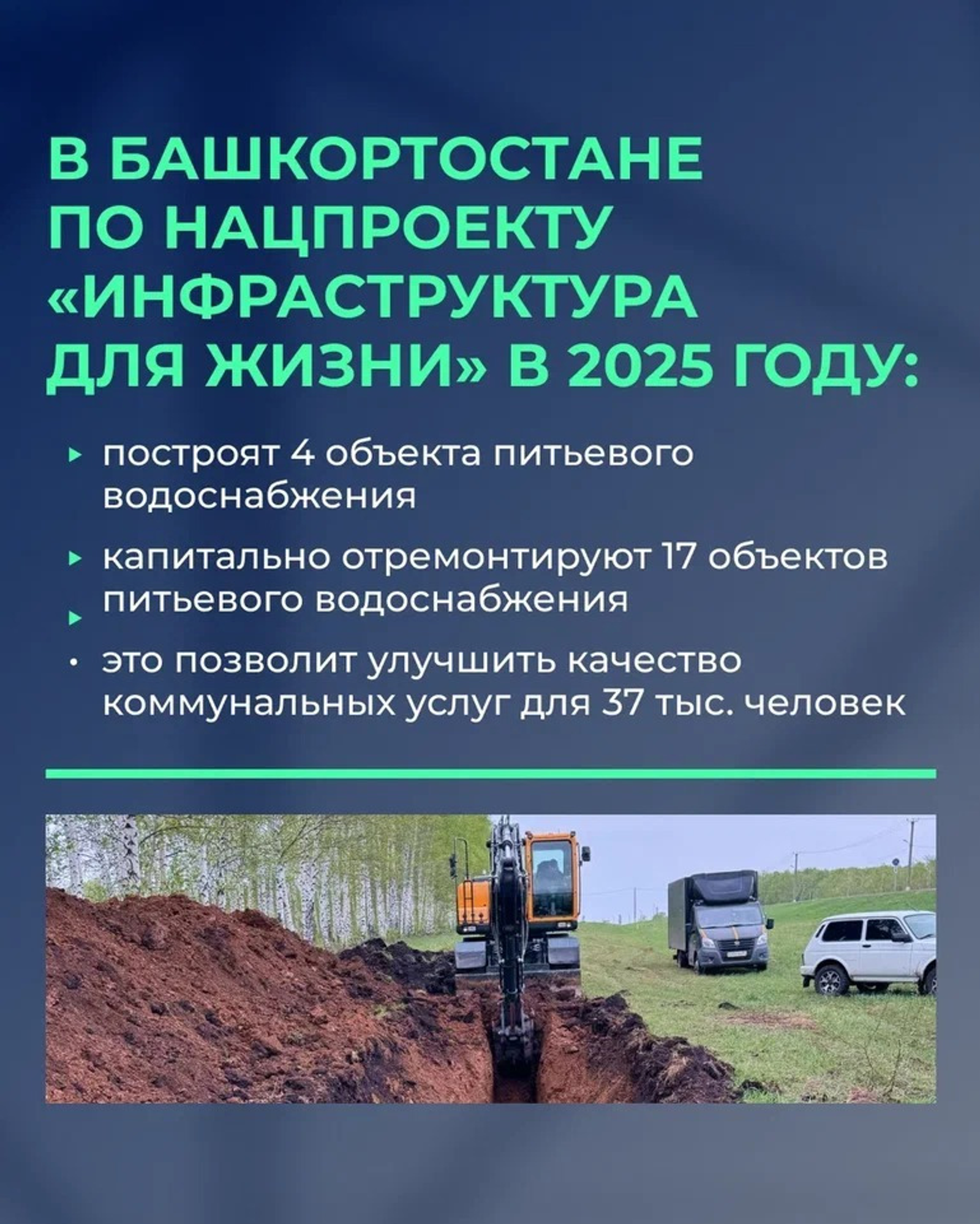 В Башкирии по нацпроекту «Инфраструктура для жизни» в этом году построят 4 и отремонтируют 17 объектов питьевого водоснабжения. Это позволит улучшить качество коммунальных услуг для 37 тысяч человек, сообщает министерство ЖКХ РБ.
