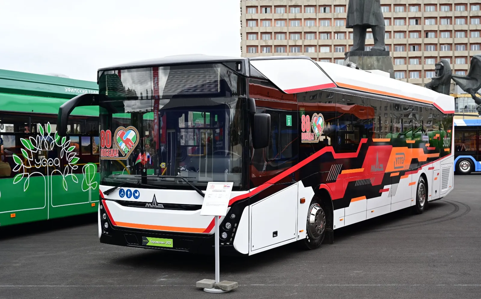 — Уфимский трамвайно-троллейбусный завод на форуме регионов России и Белоруссии представляет две модели. Это троллейбус особо большой вместимости, который в единственном пока экземпляре создан совместно с Минским автомобильным заводом и будет через месяц тестироваться в Уфе. Также за ним стоит модель 303 — новая модель Минского автомобильного завода, которая сделана абсолютно на российских компонентах этой машины, тоже машина пока в единственном экземпляре.