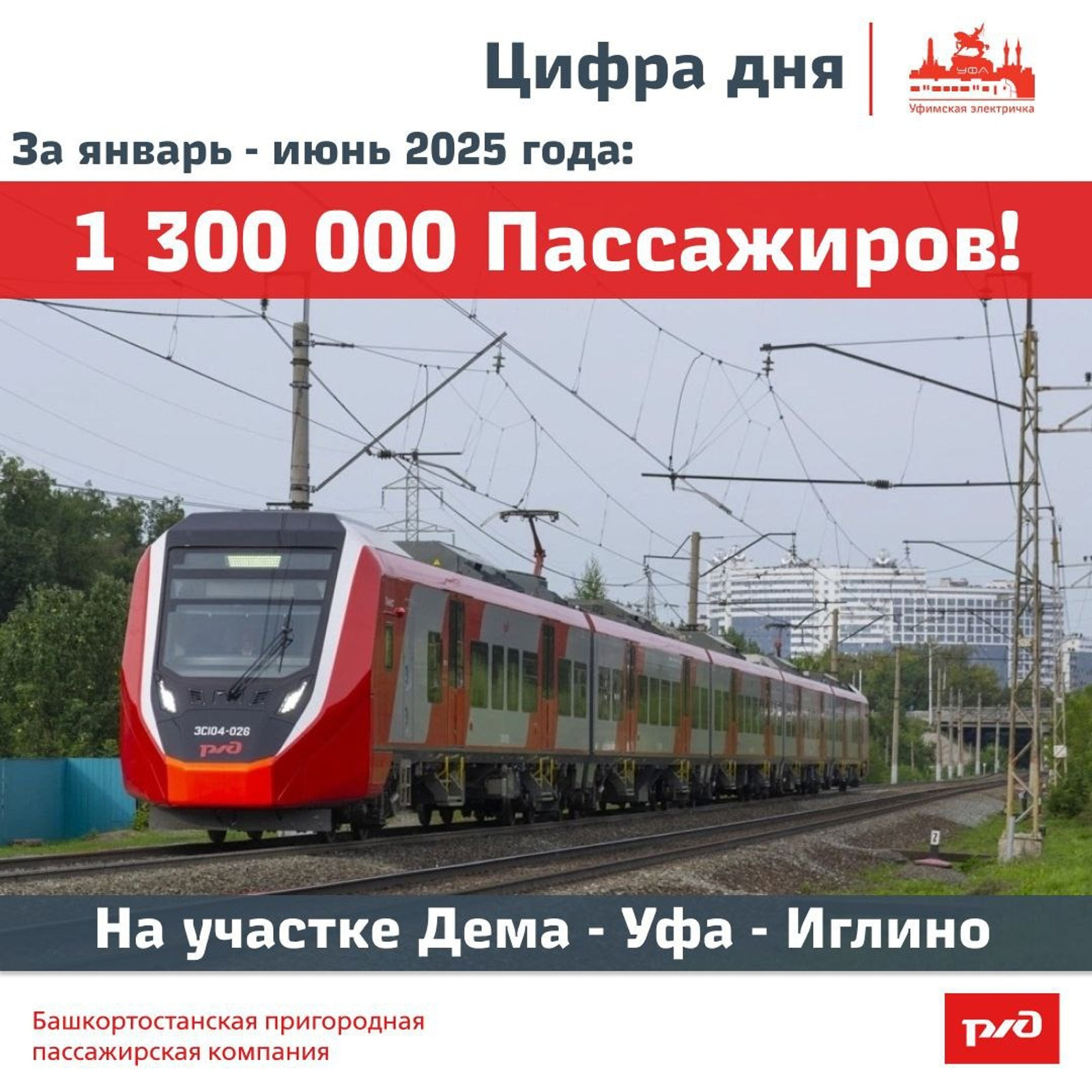 За январь–июнь пригородные поезда провезли по маршруту Дёма — Уфа — Иглино порядка 1,3 млн пассажиров — на 11% выше аналогичного периода 2024 года. Об этом сообщили в БППК.