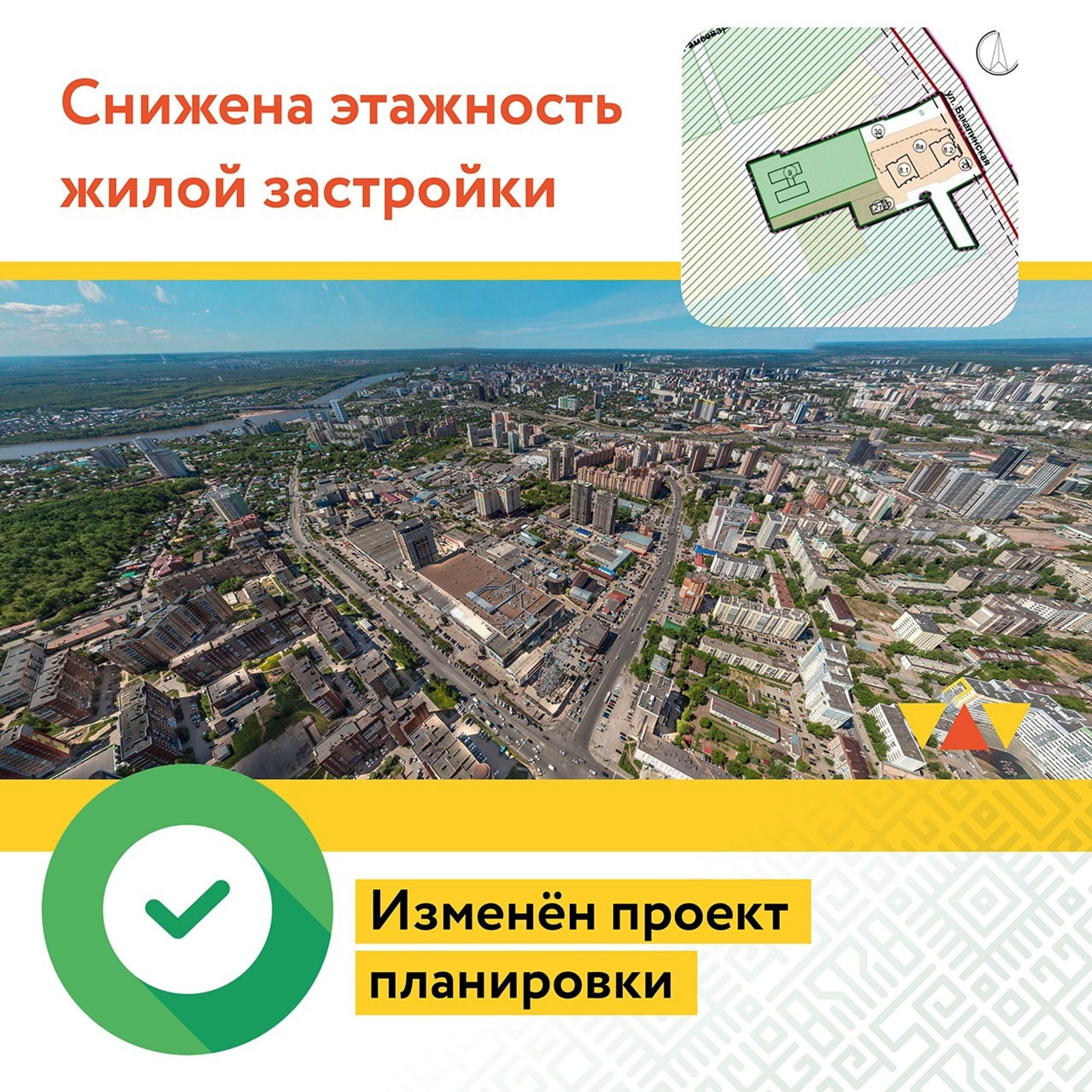 Основные изменения связаны со снижением этажности жилых домов и уменьшением площади жилой застройки с 0,81 га до 0,78 га. В новый проект также включены инфраструктурные объекты: детский сад на 285 мест, двухуровневый подземный паркинг на 168 машино-мест и трансформаторные подстанции.