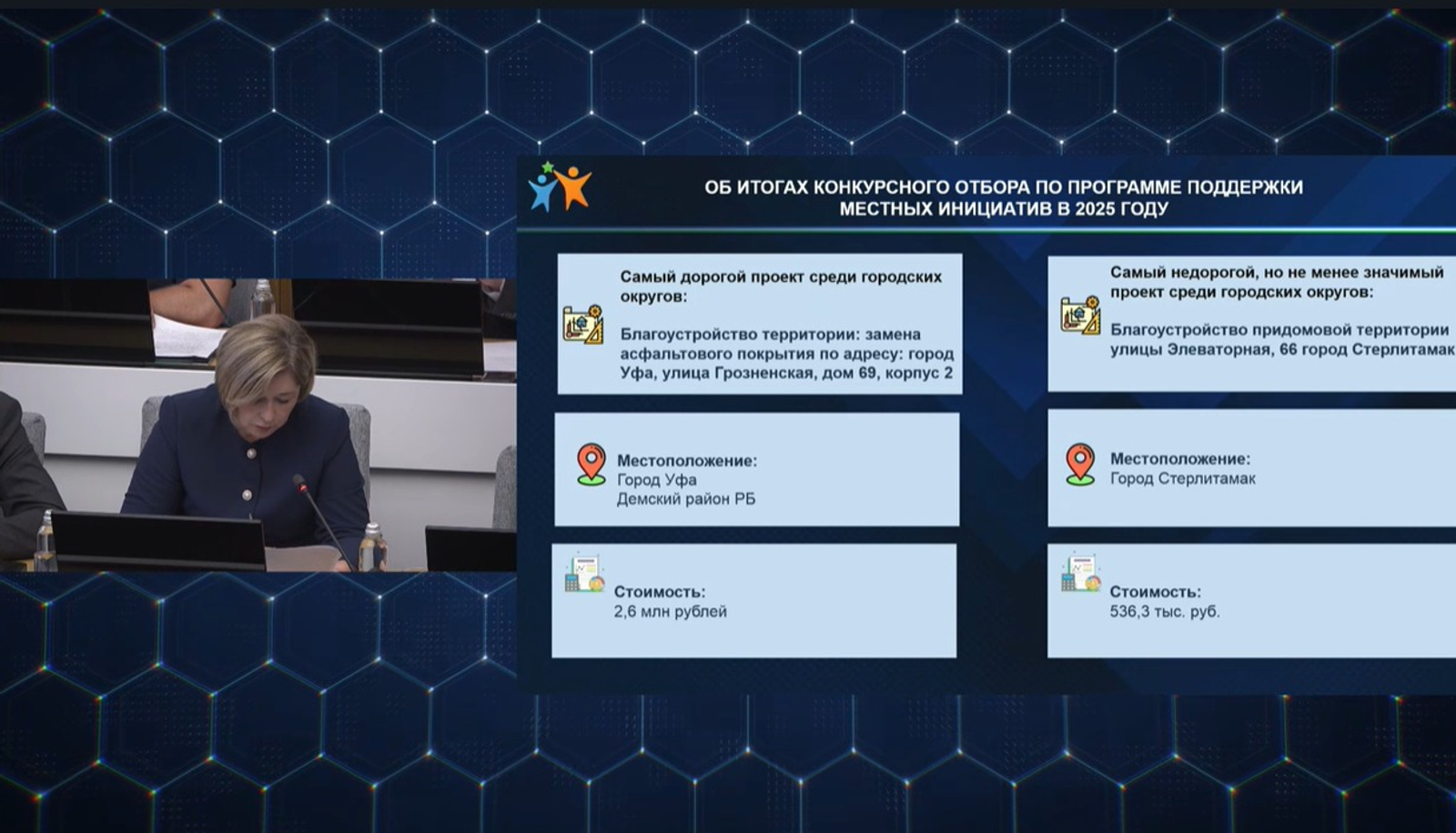 Среди проектов городских округов самым крупным проектом стала замена асфальтового покрытия в Уфе на улице Грозненская стоимостью 2 млн 650 тыс. рублей. Самый незатратный проект — благоустройство придомовой территории в Стерлитамаке со стоимостью 536,3 тыс. рублей.
