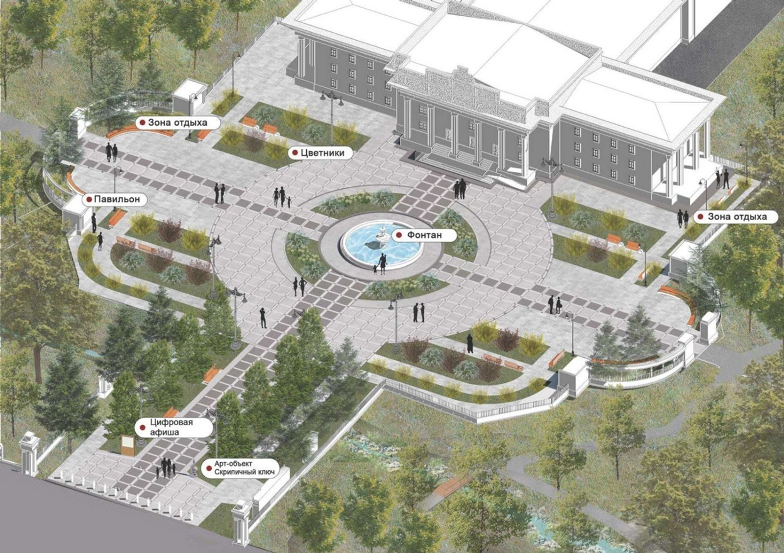 Проект деликатно переосмысляет площадку перед отремонтированным в 2024 году архитектурным ансамблем здания Музыкального колледжа и прилегающую к нему часть парка имени Юрия Гагарина. Площадь станет пешеходной культурно‑событийной зоной с местами для отдыха. Фонтан обновят. Он будет светомузыкальным и, кстати, трёхъярусным, как раньше. Вазоны, часть из которых отсутствует, по проекту обещают восстановить. Территорию покроют брусчаткой. За зданием колледжа, где сейчас расположена клумба, появится многофункциональная площадка с крытой сценой и амфитеатром, где можно будет проводить камерные мероприятия, уличные концерты и репетиции.